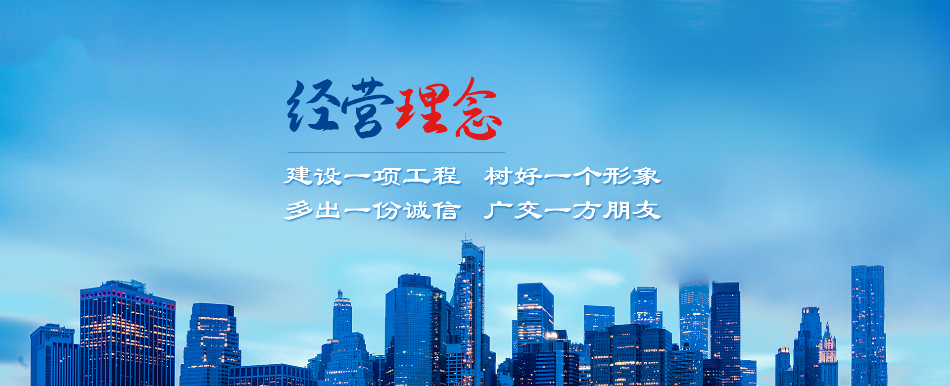 公司以建造合格建筑產(chǎn)品、助力國家建設為使命,以構建幸福企業(yè)為愿景。公司深知助力國家建設為使命所擔負的責任,故以“如履薄冰、如臨深淵、高調(diào)精細做事、低調(diào)謙虛做人”為工作理念,建立了完善的管理制度和質(zhì)量保障體系,以人為本,構建和諧環(huán)境。公司牢固樹立安全意識、文明意識、質(zhì)量意識、環(huán)境意識和精品意識。在公司質(zhì)量管理過程中貫徹“雙百”方針:即工程合格率100%,客戶滿意率100%。以“建設一項工程,樹好一個形象,多出一份誠信,廣交一方朋友”為公司經(jīng)營理念。